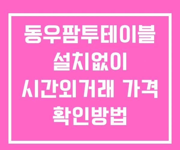 동우팜투테이블의 시간외 거래 단일가는 주식 거래 플랫폼이나 금융 정보 제공 사이트에서 쉽게 확인할 수 있습니다. 주요 증권사 앱이나 웹사이트에서는 다음과 같은 절차를 통해 확인할 수 있습니다.